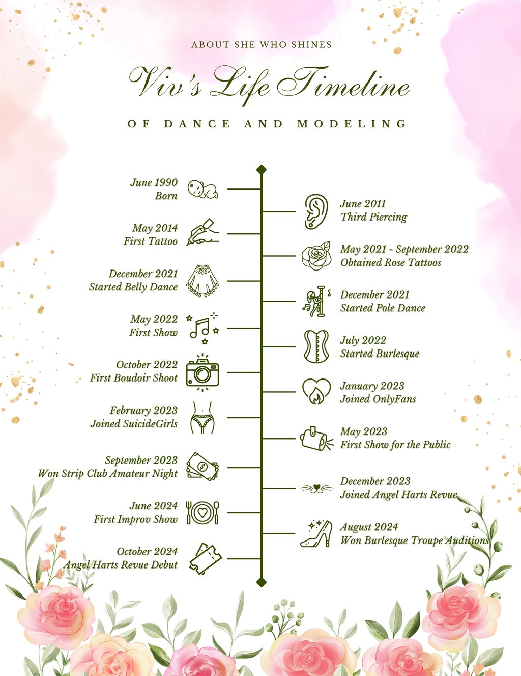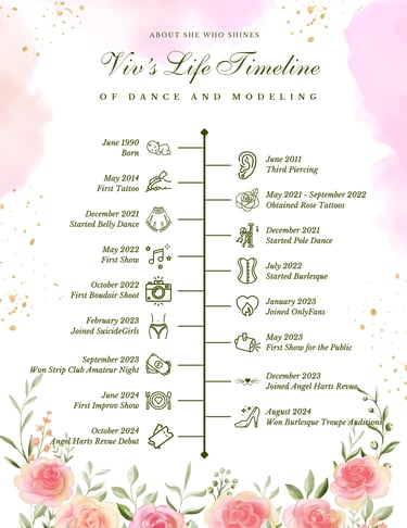 A dabbler in creative costuming since 2005, belly and pole dancing since 2021 and burlesque dancing since 2022, Viv has many unique talents to bring to the stage. Her art degree and special interest in web and graphic design come into play as well, enabling her to personally manage and market all her own pages, create and edit her own photos and graphics, and design her official website, all with skill and finesse. She is always looking for new opportunties and ways to grow, most recently by finally publishing this very site, and becoming a semi-professional dancer via Angel Harts Revue, a burlesque troupe based in Central PA.
